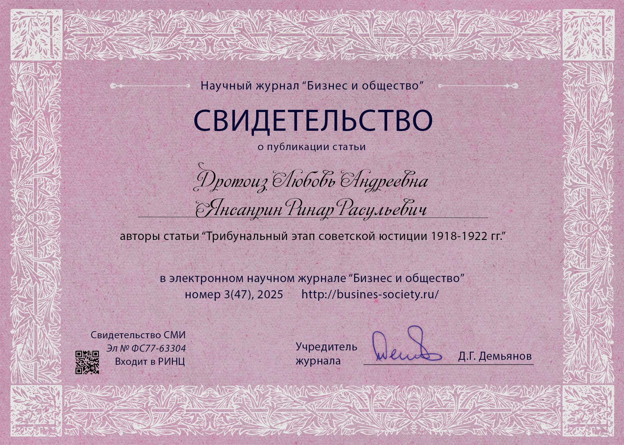 Дротоиз, Л. А. Трибунальный этап советской юстиции 1918-1922 гг. / Л. А. Дротоиз, Р. Р. Янсанрин. – Текст : электронный // Бизнес и общество : электронный журнал. – 2025. – N 3 (47). – ISSN 2409-6040. – URL: https://busines-society.ru/2025/3-47/79_drotoiz.pdf. – Дата публикации 19.09.2025. | ||||