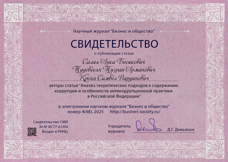 Салия, Л. Б. Анализ теоретических подходов к содержанию коррупции и особенности антикоррупционной практики в Российской Федерации / Л. Б. Салия, Т. А. Тадевосян, С. В. Кроян. – Текст : электронный // Бизнес и общество : электронный журнал. – 2025. – N 4 (48). – ISSN 2409-6040. – URL: https://busines-society.ru/2025/4-48/75_tadevosjan.pdf. – Дата публикации 28.11.2025. | ||||