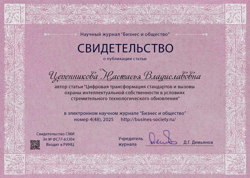 Цепенникова, Н. В. Цифровая трансформация стандартов и вызовы охраны интеллектуальной собственности в условиях стремительного технологического обновления / Н. В. Цепенникова. – Текст : электронный // Бизнес и общество : электронный журнал. – 2025. – N 4 (48). – ISSN 2409-6040. – URL: https://busines-society.ru/2025/4-48/76_cepennikova.pdf. – Дата публикации 05.12.2025. |