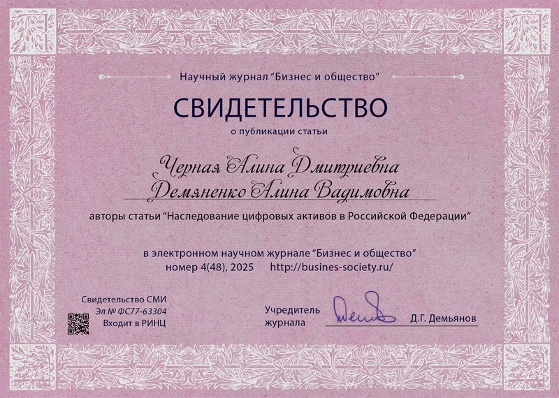 Демяненко, А. В. Наследование цифровых активов в Российской Федерации / А. Д. Черная, А. В. Демяненко. – Текст : электронный // Бизнес и общество : электронный журнал. – 2025. – N 4 (48). – ISSN 2409-6040. – URL: https://busines-society.ru/2025/4-48/78_demjanenko.pdf. – Дата публикации 16.12.2025. | ||||