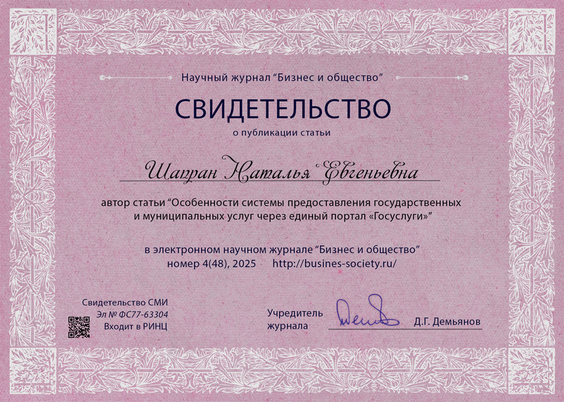 Шапран, Н. Е. Особенности системы предоставления государственных и муниципальных услуг через единый портал «Госуслуги» / Н. Е. Шапран. – Текст : электронный // Бизнес и общество : электронный журнал. – 2025. – N 4 (48). – ISSN 2409-6040. – URL: https://busines-society.ru/2025/4-48/73_shapran.pdf. – Дата публикации 28.10.2025. | ||||