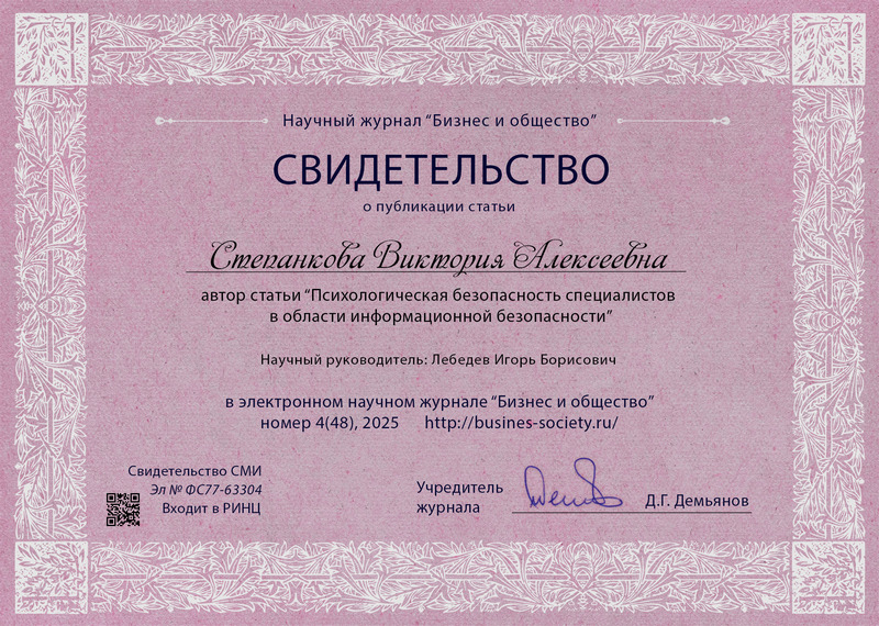 Степанкова, В. А. Психологическая безопасность специалистов в области информационной безопасности / В. А. Степанкова. – Текст : электронный // Бизнес и общество : электронный журнал. – 2025. – N 4 (48). – ISSN 2409-6040. – URL: https://busines-society.ru/2025/4-48/62_stepankova.pdf. – Дата публикации 02.12.2025. |