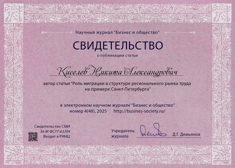 Киселев, Н. А. Роль миграции в структуре регионального рынка труда на примере Санкт-Петербурга / Н. А. Киселев. – Текст : электронный // Бизнес и общество : электронный журнал. – 2025. – N 4 (48). – ISSN 2409-6040. – URL: https://busines-society.ru/2025/4-48/51_kiselev.pdf. – Дата публикации 09.12.2025. | ||||