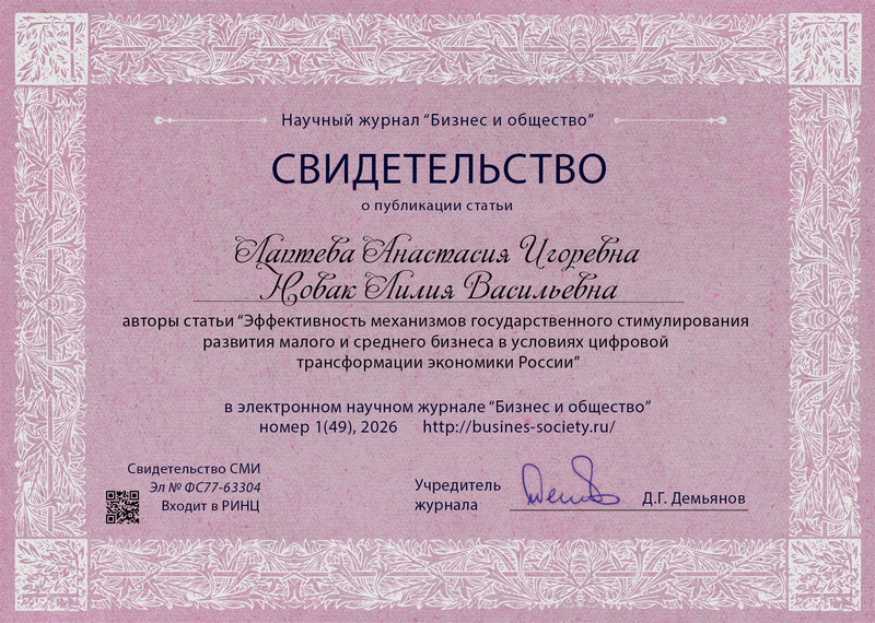 Лаптева, А. И. Эффективность механизмов государственного стимулирования развития малого и среднего бизнеса в условиях цифровой трансформации экономики России / А. И. Лаптева, Л. В. Новак. – Текст : электронный // Бизнес и общество : электронный журнал. – 2026. – N 1 (49). – ISSN 2409-6040. – URL: https://busines-society.ru/2026/1-49/30_lapteva.pdf. – Дата публикации 21.11.2025. |