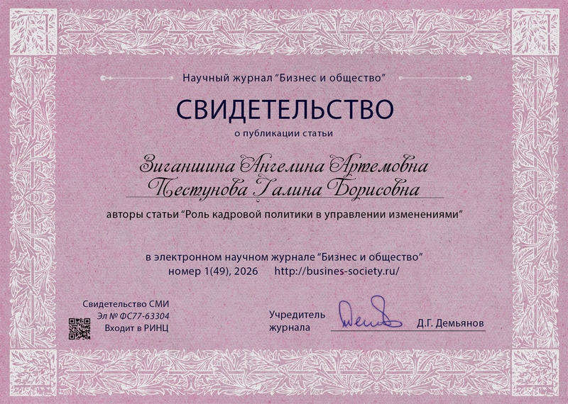 Зиганшина, А. А. Роль кадровой политики в управлении изменениями / А. А. Зиганшина, Г. Б. Пестунова. – Текст : электронный // Бизнес и общество : электронный журнал. – 2026. – N 1 (49). – ISSN 2409-6040. – URL: https://busines-society.ru/2026/1-49/58_ziganshina.pdf. – Дата публикации 19.12.2025. |