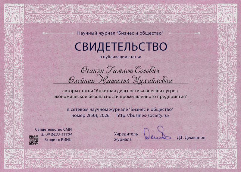 Оганян, Г. С. Анкетная диагностика внешних угроз экономической безопасности промышленного предприятия / Г. С. Оганян, Н. М. Олейник. – Текст : электронный // Бизнес и общество : электронный журнал. – 2026. – N 2 (50). – ISSN 2409-6040. – URL: https://busines-society.ru/2026/2-50/30_olejnik.pdf. – Дата публикации 20.03.2026. | ||||